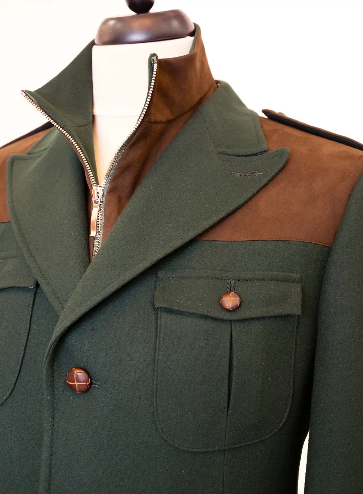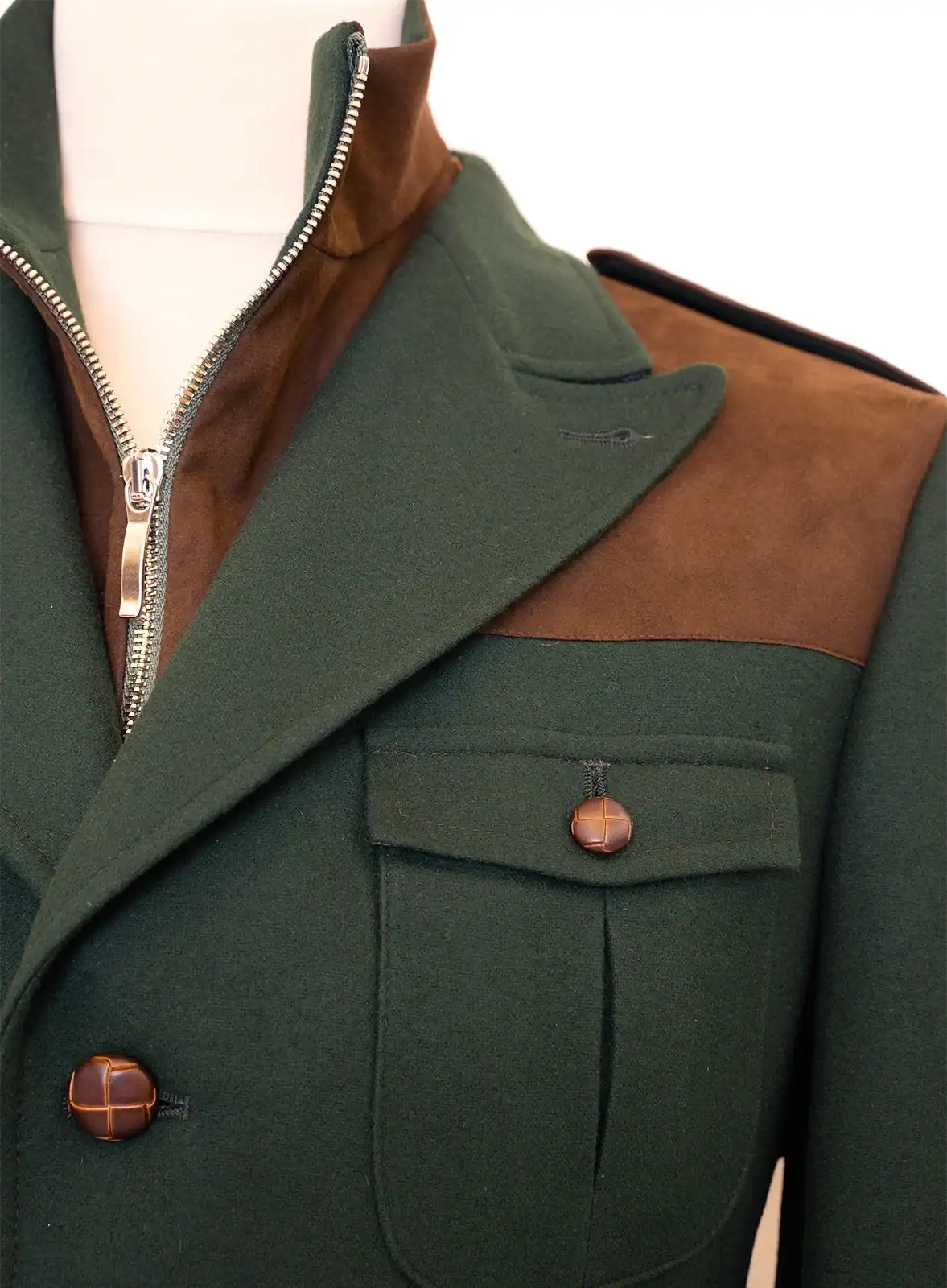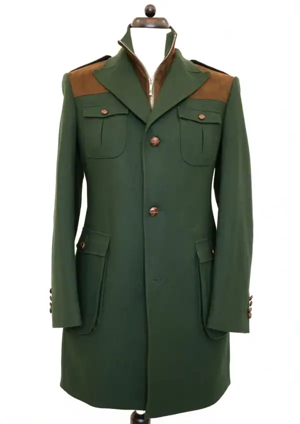 A kabát méretre készített, biztosítva a tökéletes illeszkedést és kényelmet. A klasszikus szabásvonalak és a hátán található bőséghajtás lehetővé teszik a szabad mozgást, miközben elegáns megjelenést biztosítanak.